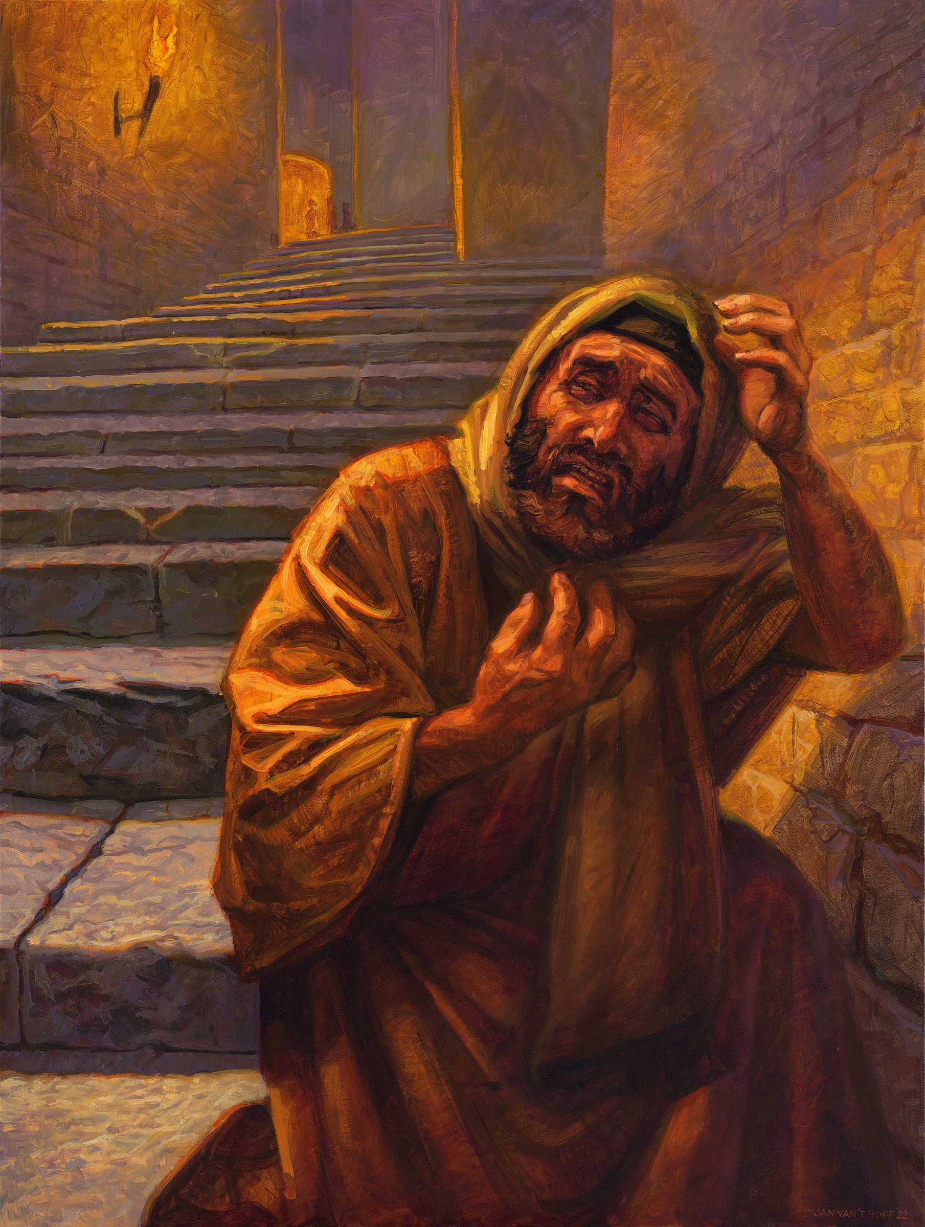 Сатана заставляет Петра трижды отречься от Иисуса. Затем Иисус поворачивается и смотрит на него. Петр раскаивается и, выйдя, горько плачет.
