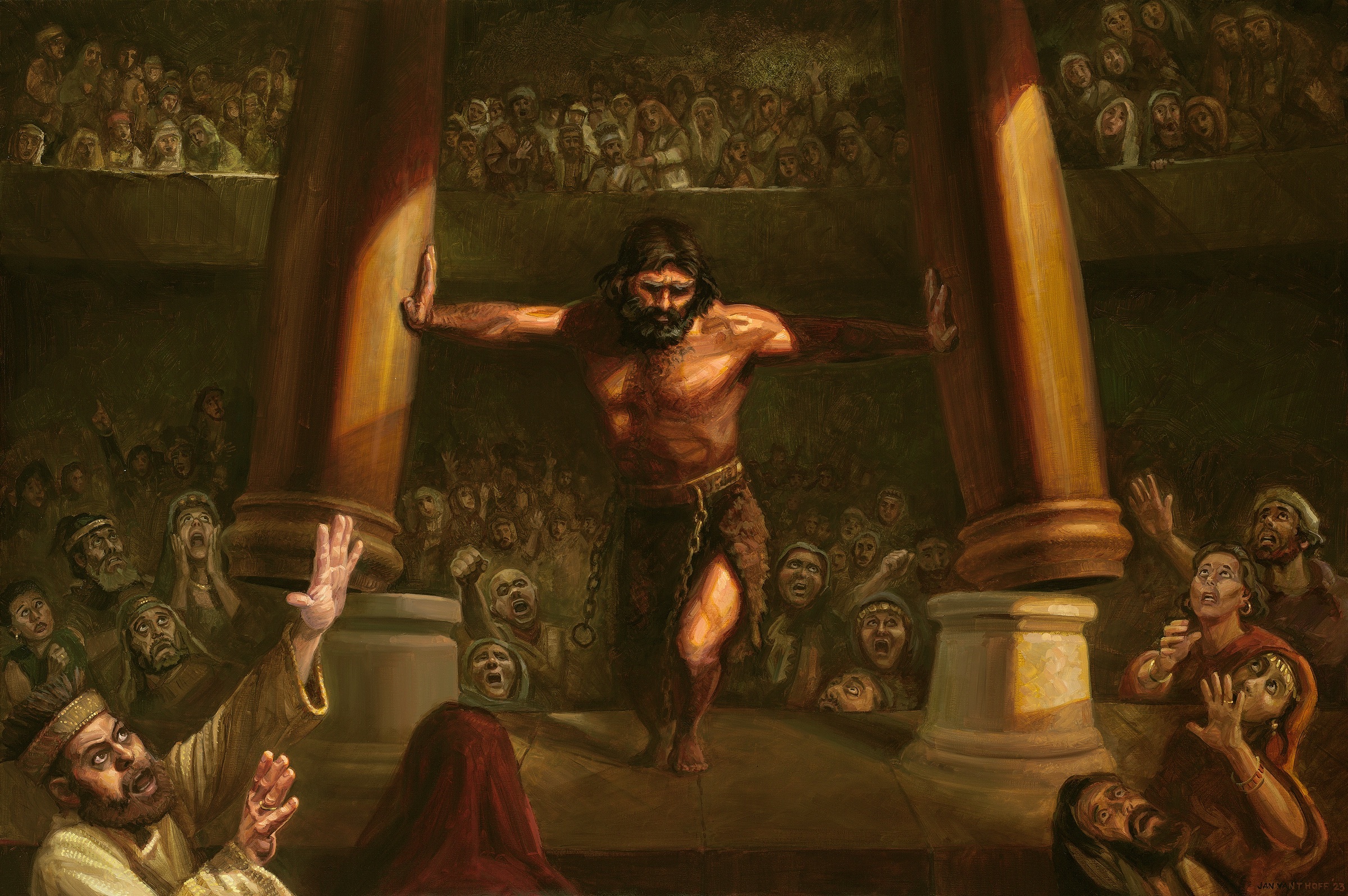 Последняя битва Самсона с филистимлянами происходит в храме Дагона. Когда он умирает под разрушающимся храмом, вместе с ним умирают многие филистимляне.