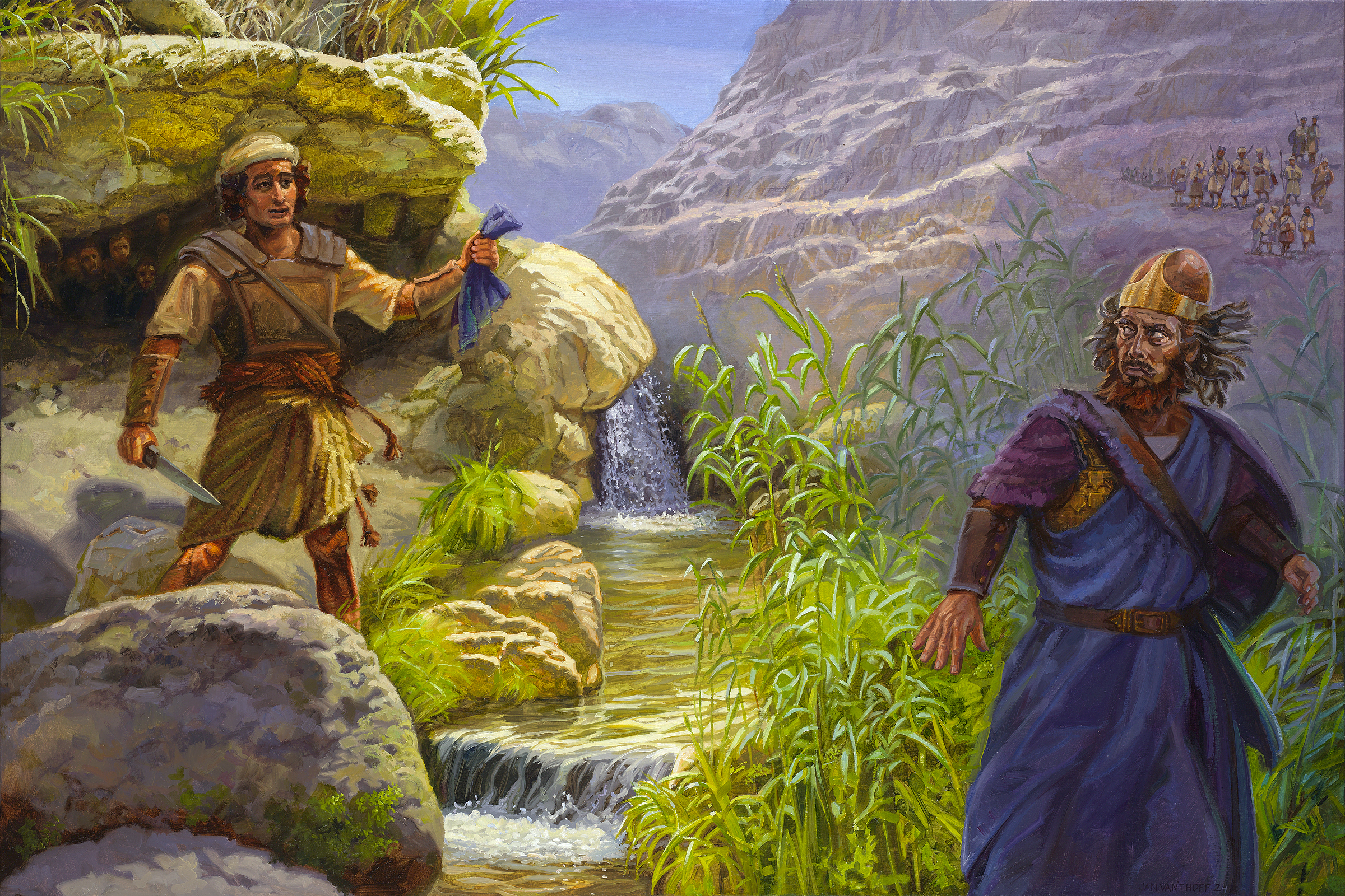 Саул преследует его с тремя тысячами своих лучших людей. Давид и его люди прячутся в большой пещере. Именно в эту пещеру приходит Саул, чтобы справить нужду. У Давида есть возможность убить Саула. Бог как бы отдает Саула в его руки. Но Давид проявляет уважение к Саулу, как к помазанному Богом царю. Хотя Давид уже был помазан на царство над Израилем, он ждет Божьего времени и не испытывает кровной вины.