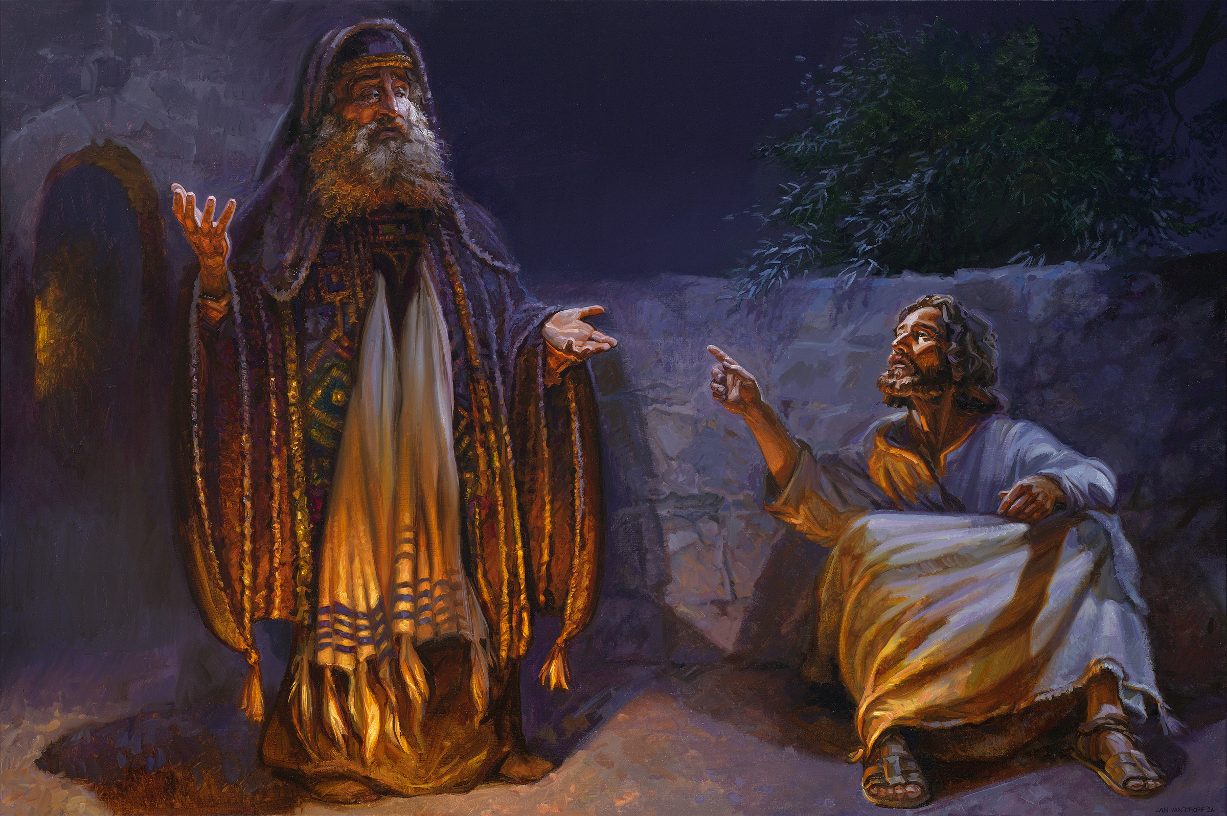 Никодим, человек из фарисеев, член иудейского высшего совета (Синедриона), видит в Иисусе учителя/пророка, посланного Богом, который совершает особые знамения.