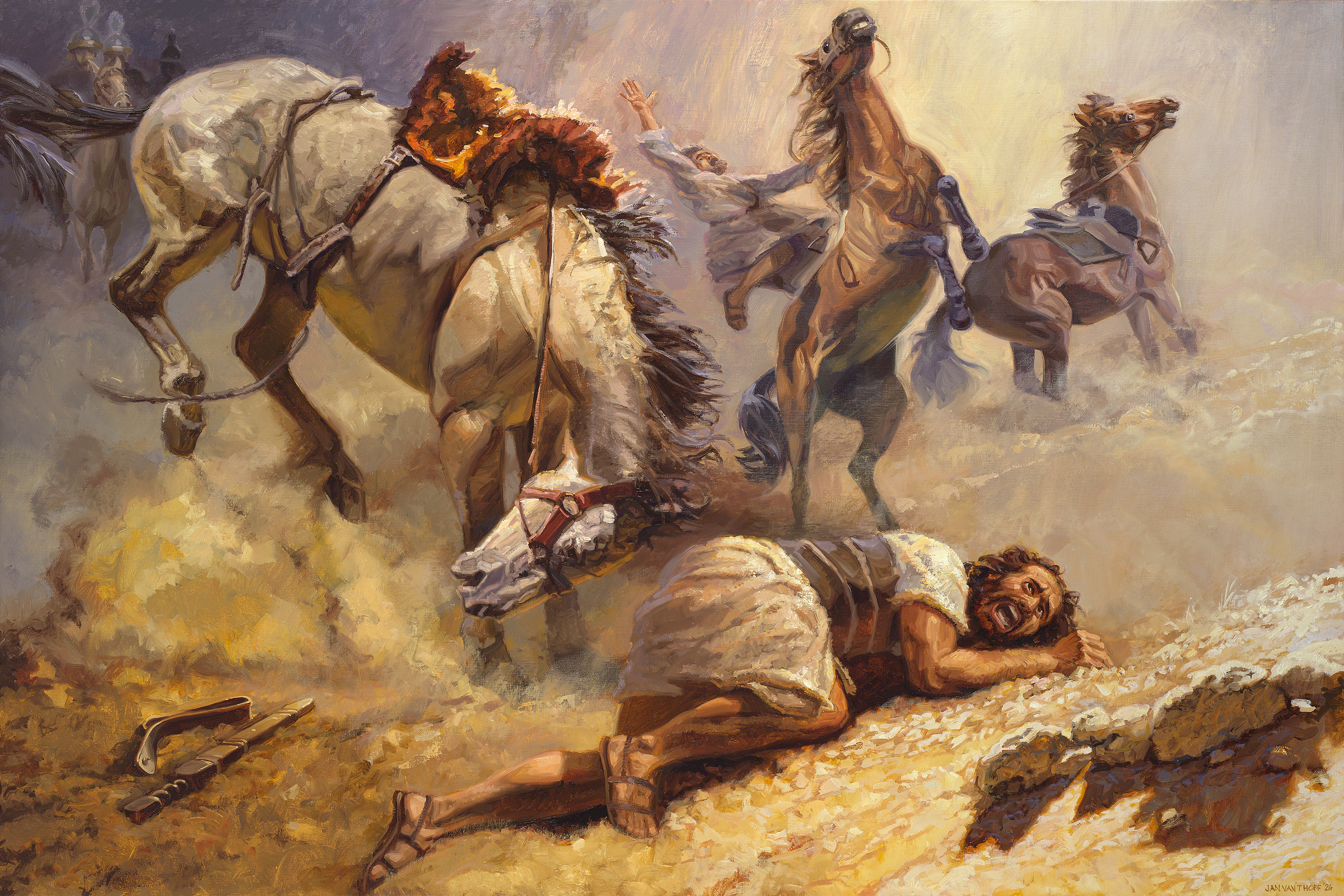 Около Дамаска вокруг него вдруг засиял свет, ярче солнца. Савл и его спутники падают на землю. Ему является Сам Иисус Христос и обращается к нему на еврейском языке: «Савл, Савл, что ты Меня гонишь?»