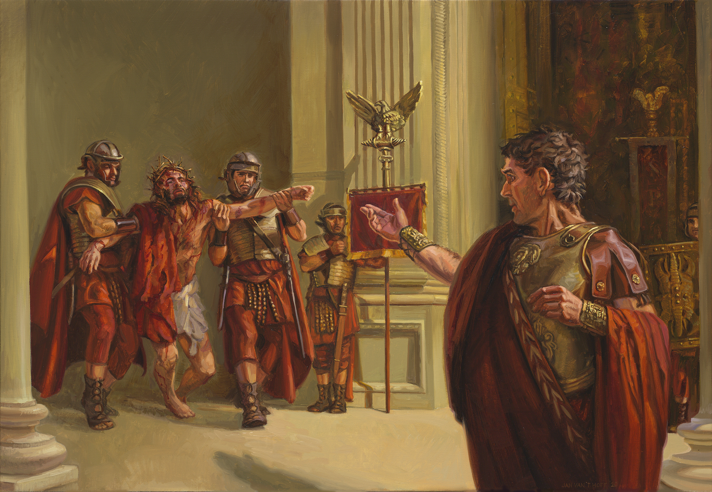 После этого Пилат выводит Иисуса и говорит толпе: «Вот этот Человек!» Он, может быть, хотел сказать: как такой несчастный Человек может быть для кого-то опасным?