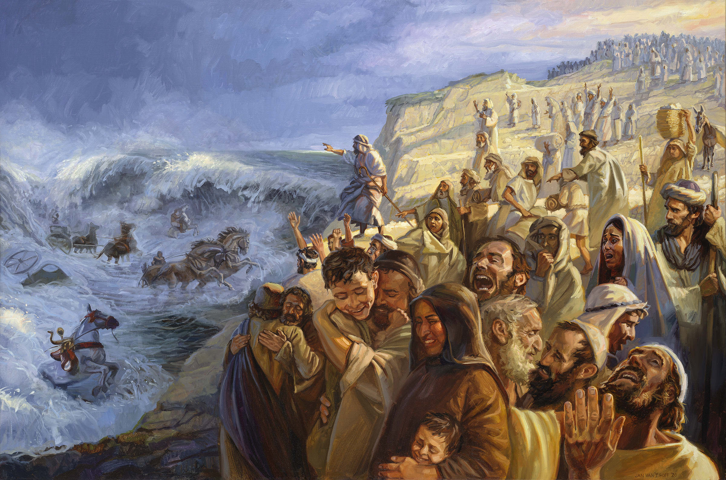 После десяти казней, которые Господь послал на Египет, фараон, наконец, отпустил народ. Через несколько мгновений он сожалеет об этом и решает пойти за ними. Израильтяне в бедственном положении: море отрезает им путь вперед, их преследует египетская армия. Спасительное присутствие Божие появляется, когда Ангел Господний становится между ними в столпе облачном, так что египтяне не могут приблизиться к народу Израиля. Моисей должен поднять свой посох, протянуть руку над морем и разделить его. Тогда Господь сильным восточным ветром разделяет море и делает его сушею. Люди идут посреди моря по суше. Смотрите также Евреям глава 11 стих 29.
