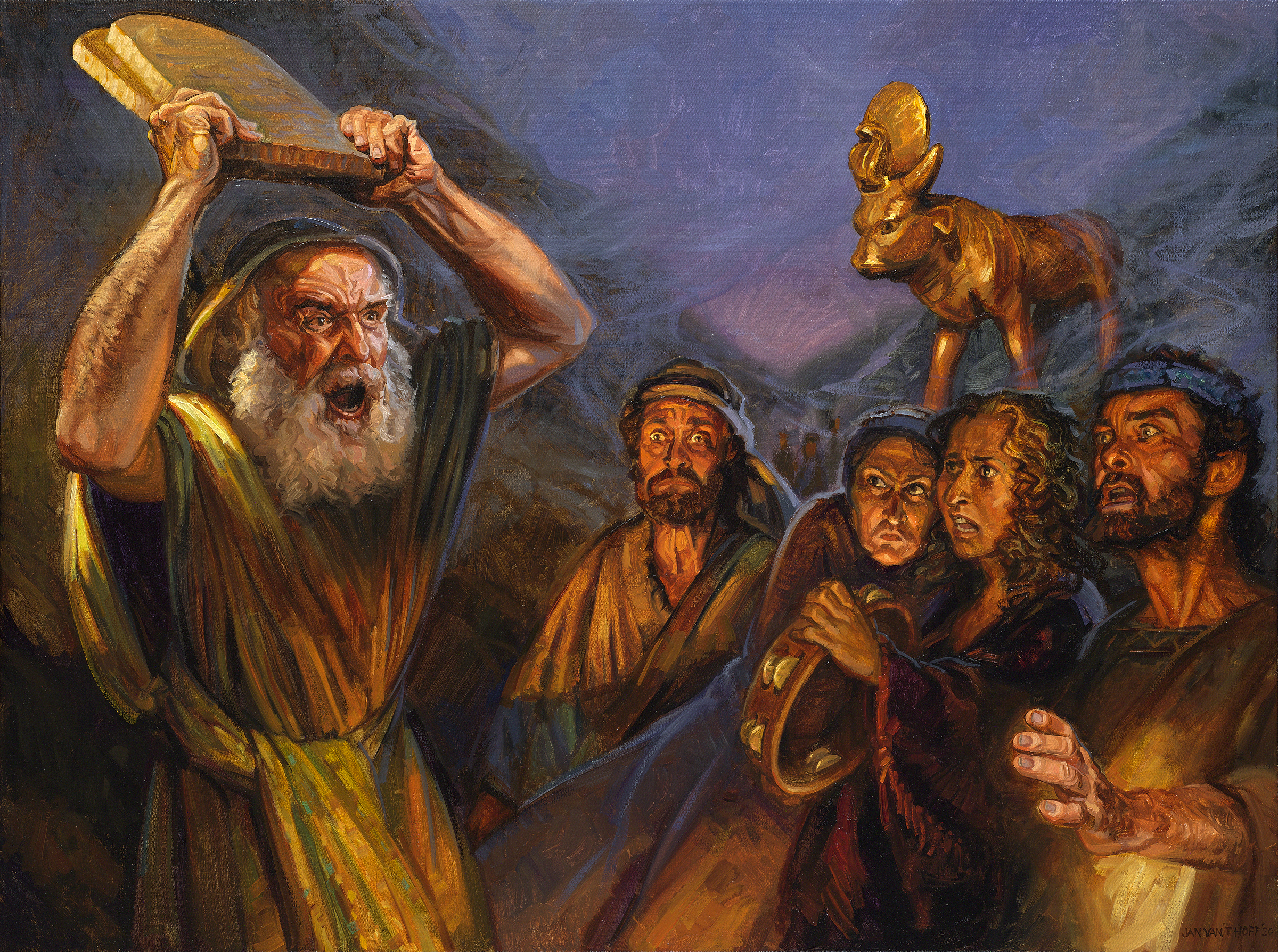 Однако это против воли Божией. На горе Он говорит с Моисеем и повелевает ему спуститься, потому что «люди развратились». Когда Моисей спускается и видит поклонение золотому тельцу, «его гнев воспламеняется, и он выбрасывает скрижали из рук своих и разбивает их у подножия горы».