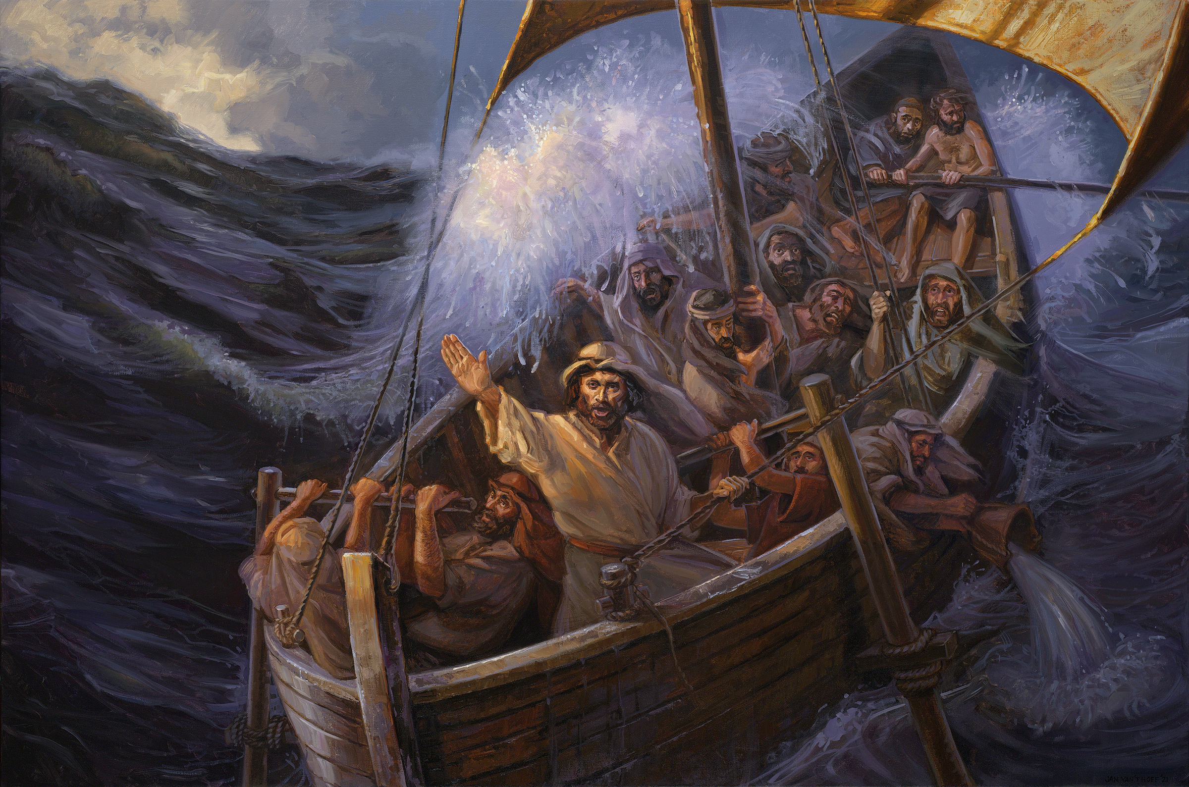 Ученики, бывшие рыбаками по профессии и знакомые с ситуацией на озере, не могут предотвратить затопление лодки. В своем бедствии они будят Иисуса и взывают: «Господи, спаси нас, мы погибаем!» Так как в своем горе они понимают, что Он может помочь. Проснувшись, Иисус спрашивает их, почему они так беспокоятся. «Где была ваша вера?» Луки 8 стих 25.