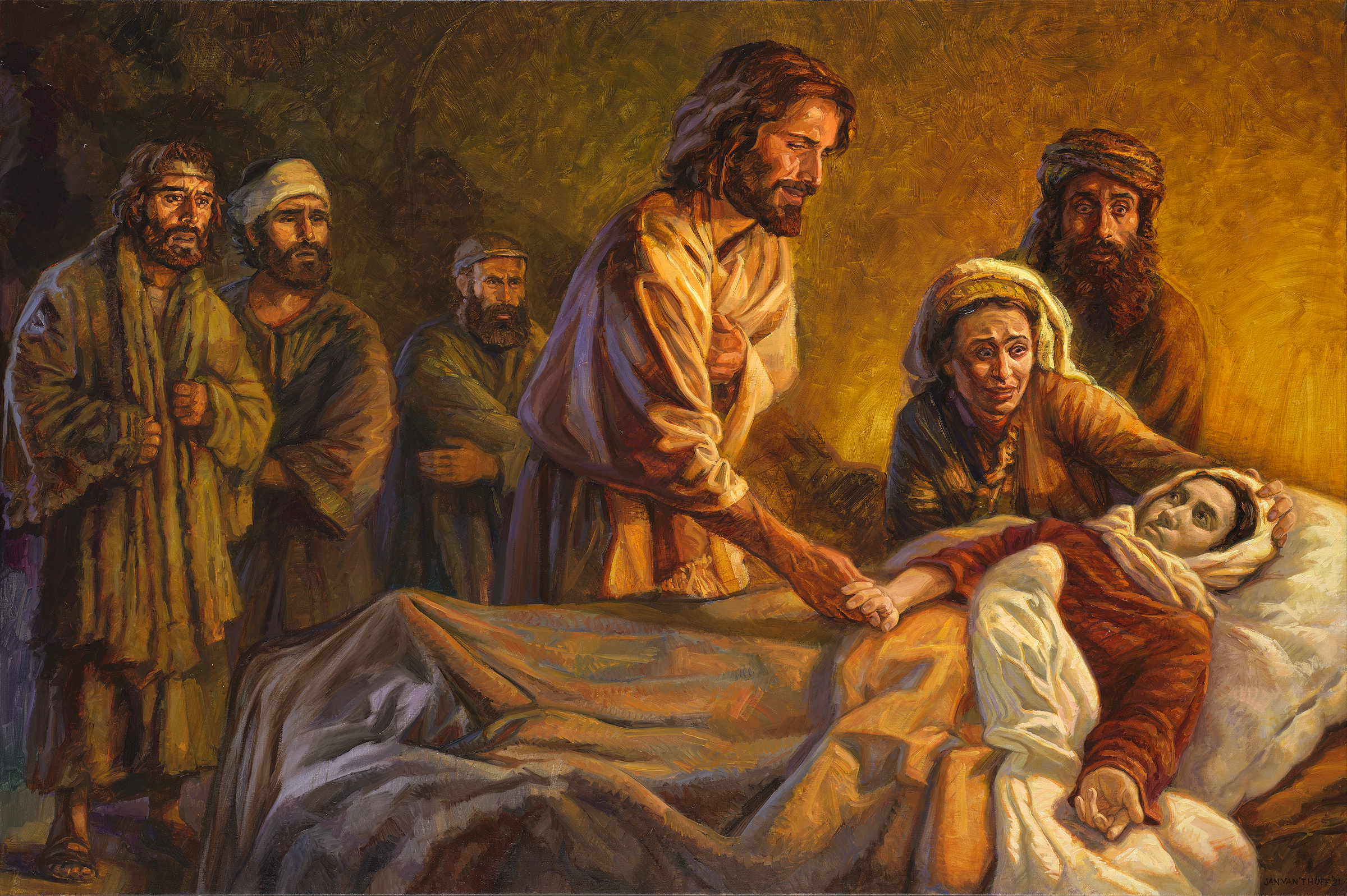 Когда из дома Иаира приносят новости о том, что его дочь тем временем умерла, Иисус ободряет Иаира и говорит ему не бояться, а только верить.